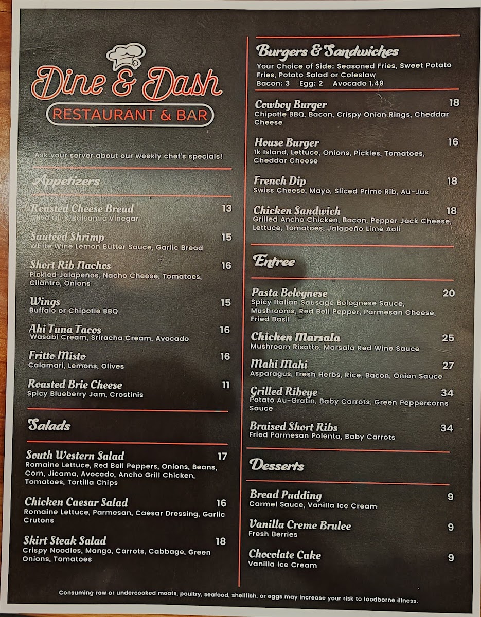 Dine n Dash is well-known for its mouthwatering American classic comfort food. With a menu that boasts scrumptious burgers, delectable sandwiches, and enticing entrees, there's something to please every palate. Dive into their Cowboy Burger, which features a juicy beef patty topped with chipotle BBQ sauce, crispy onion rings, and cheddar cheese, all for just $18.00. Or, if you're in the mood for something lighter yet flavorful, the Grilled Ancho Chicken Sandwich served with bacon, pepper jack cheese, and zesty jalapeño lime aioli is a crowd favorite.